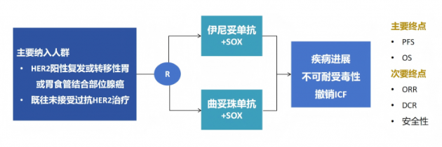 本研究采用随机对照的方法,将38例HER2阳性晚期胃癌或胃食管结合部腺癌患者随机分为两组:一组接受伊尼妥单抗联合SOX方案治疗,另一组接受曲妥珠单抗联合SOX方案治疗。经过4-6个周期的治疗后,病情稳定的患者接受维持治疗。本研究的主要终点是无进展生存期(PFS)和总生存期(OS),次要终点是客观缓解率(ORR)、疾病控制率(DCR)和不良事件(AEs)。