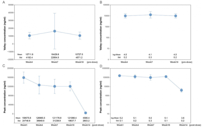 另外,作为探索性终点,平均最高血药浓度(Cmax)为126985.5 ± 38949.6ng/ml,平均最低血药浓度(Cmin)为10711.9 ± 4192.4 ng/ml(详见图2)。药代动力学的结果显示,Cmin显著高于同类产品有效阈值。