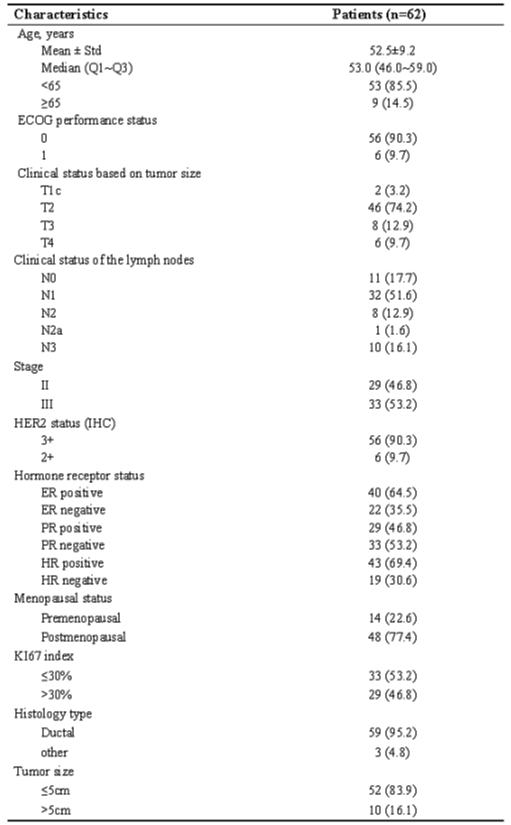 HER2阳性乳腺癌在所有乳腺癌中占比约为20%~30%,对于早期或局部晚期HER2阳性的乳腺癌患者,新辅助治疗达到完全缓解能够显著改善生存,目前TCbHP及THP方案已经成为标准治疗推荐。本研究参考当前临床实践,采用单臂、多中心的试验设计,纳入了62例HER2阳性(IHC 3+或者IHC 2+/FISH+)早期或局部晚期乳腺癌患者,采用wABX+HP4周期方案治疗:伊尼妥单抗(初始负荷剂量8 mg/kg,维持剂量为6 mg/kg,q3w,4周期)联合帕妥珠单抗(初始负荷剂量840 mg,维持剂量为420 mg,q3w,4周期)及白蛋白紫杉醇(剂量为125 mg/m2,qw,12周)。