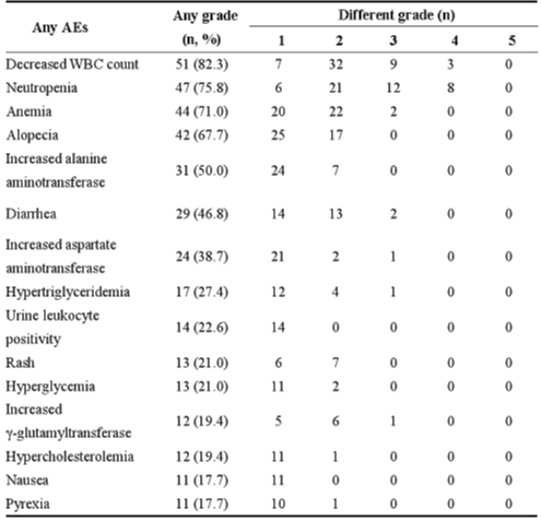 本研究观察到的不良反应与已知的安全性特征相符,未发现新的风险信号。主要的不良反应包括:血液系统异常,如白细胞计数降低、中性粒细胞计数降低、贫血,肝功能异常和腹泻等。≥3级的治疗相关不良反应主要为中性粒细胞计数降低(22.6%)、白细胞计数降低(11.3%)、感染性肺炎(3.2%)、贫血(3.2%)、腹泻(3.2%)(不良事件详见表3)。所有不良事件均未导致治疗终止或患者死亡,与现有双靶联合方案相比展现出更优的安全性谱。