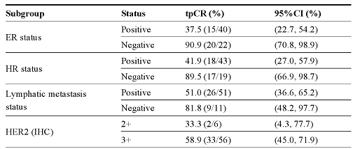 经过12周,共计4个周期的治疗,全分析集(FAS)中的62例患者疗效可评价,总病理缓解率(tpCR)为56.5%(95% CI: 43.3%-69.0%),符合方案分析集(PPS)中的61例患者总病理缓解率(tpCR)为57.4%(95% CI: 44.1%-70.0%)(详见表2)。特别注意的是:雌激素受体(ER)阴性的患者tpCR高达90.9%(95% CI: 70.8%-98.9%)。