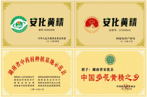 安化多花黄精根据近代药物学家陈仁山1930年编写的《药物出产辩》记载:“黄精以湖南产者为正。其中,多花黄精分布最广,蕴藏量大,品质好,是我国多花黄精主要产区之一。”安化中药材资源丰富,素有“湘中药库”之称,被誉为“中国多花黄精之乡”,安化黄精已经获得国家农产品地理标志登记和注册国家地理标志证明商标。
